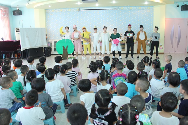 此活动分两部分进行。第一部分,由大班幼儿与老师进行节目表演。大班小朋友歌舞表演《中国功夫》、《感恩的心》、《蔬菜进行曲》、《快乐星猫》精彩纷呈,赢得小班小朋友们的阵阵掌声;由老师们表演的童话剧《谁来哄我睡觉》风趣幽默,给孩子们留下美好的印象。第二部分,由中班幼儿给小班新生送礼物。中班小朋友将亲手做的礼物送给小班新生,孩子们真挚的祝福表达了她们关心弟弟妹妹的情感和愿望。